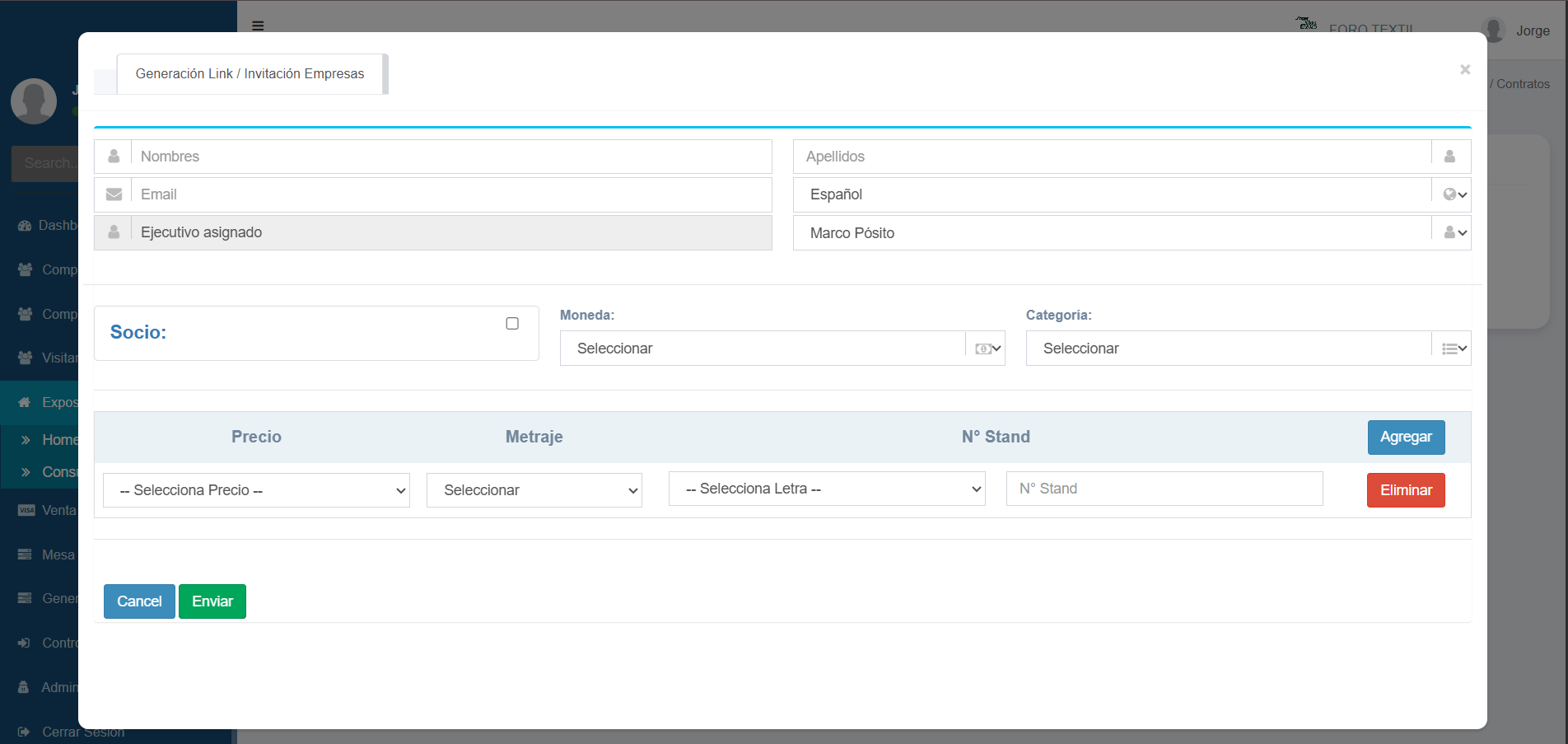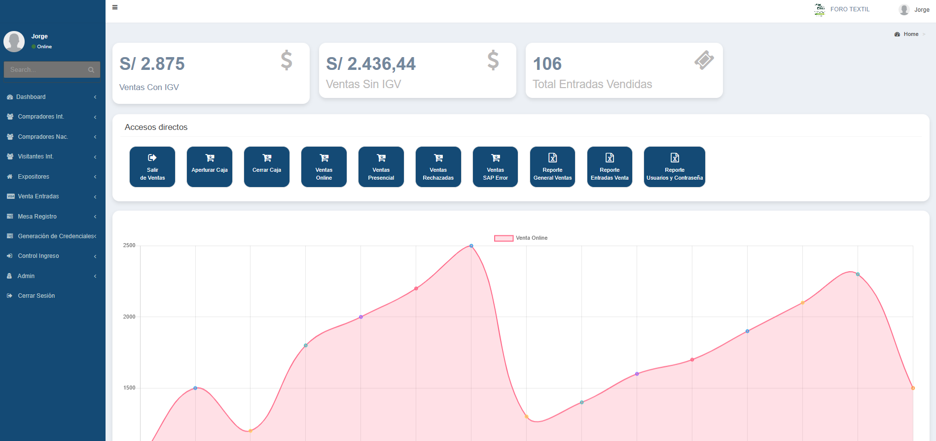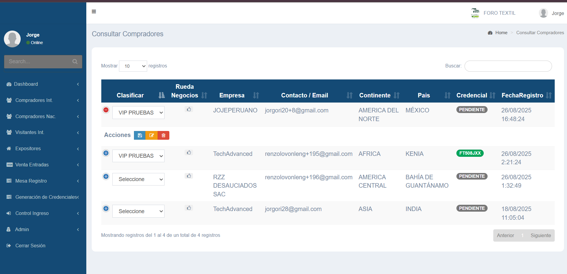 El sistema permite administrar contratos, stands, acreditaciones, ruedas de negocios, fichas logísticas y reportes en tiempo real, todo desde un único panel administrativo.